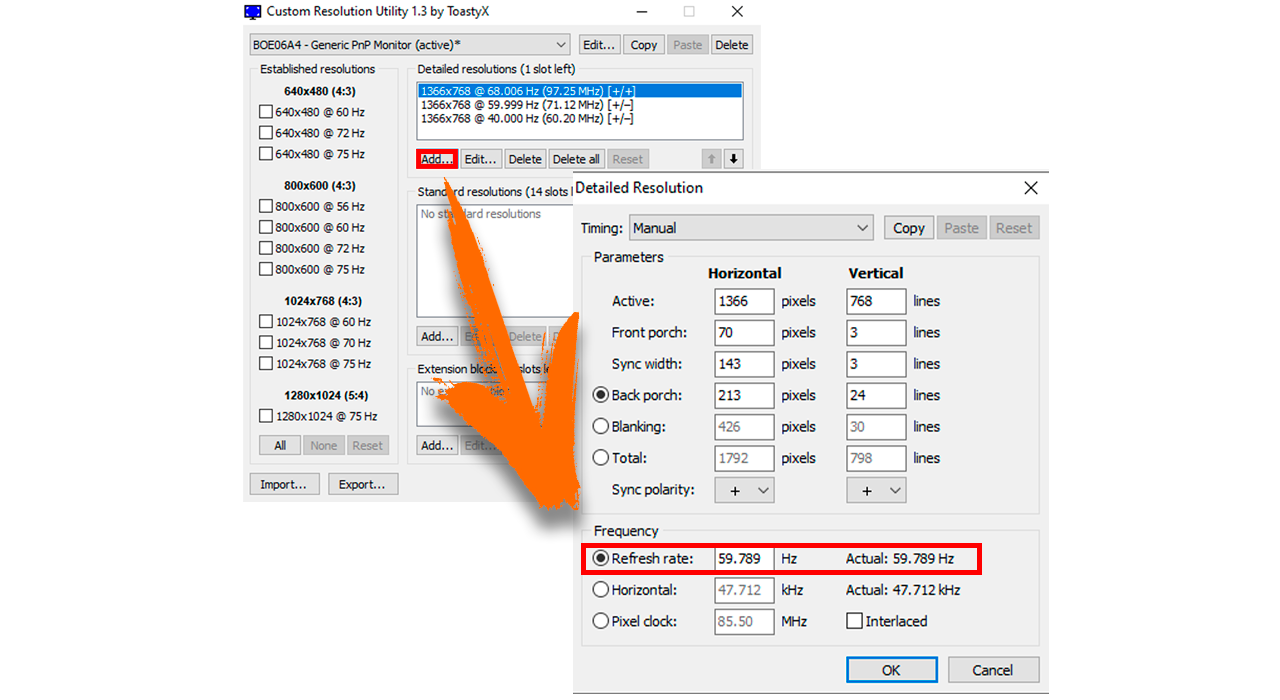 - Selecciona Add seguidamente en el apartado de Refresh rate actualiza el valor inicial de tus Hz.( 1 Hz a la vez)